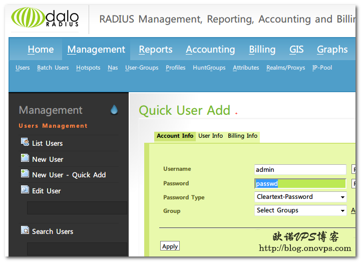 之前有介绍安装Radiusmanager做为ROS验证服务器,不过Radiusmanager为商业软件,喜欢开源软件的可使用daloRADIUS替代,功能同样强大。